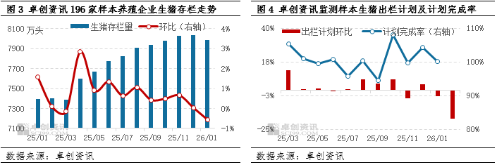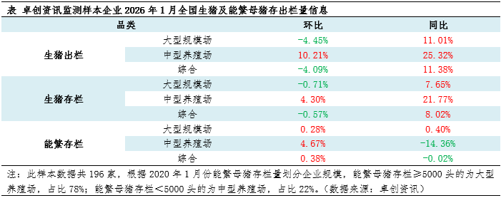 卓创资讯监测196家样本养殖企业生猪存出栏数据显示,1月能繁母猪存栏与生猪存栏走势相悖。能繁母猪存栏1月份延续增势,环比增加0.38%。而生猪存栏量由2025年12月份增加0.03%转为1月份减少0.57%。