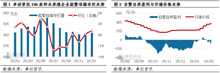 卓创资讯监测196家样本养殖企业1月能繁母猪存栏量环比微增。支撑能繁母猪存栏回升的主要因素有三点:一是1月养殖端仔猪补栏积极性明显提升,仔猪价格同步进入上行通道;截至1月底,卓创资讯监测全国7公斤仔猪月度交易均价为291.96元/头,环比上涨34.14%。二是养殖端亏损幅度显著缓解,截至1月底,自繁自养月度平均盈利为-6.34元/头,环比上涨96.57%,亏损大幅收窄。仔猪价格回暖叠加养殖亏损减少,明显削弱了市场淘汰能繁母猪的意愿。此外,北方部分区域养殖场仍有投产补栏动作,进一步对存栏形成多支撑。但1月国内部分区域局部猪病出现复发,造成部分能繁母猪存栏受损,对存栏增幅形成制约。因此,1月能繁母猪存栏虽环比增加,但整体增幅有限。