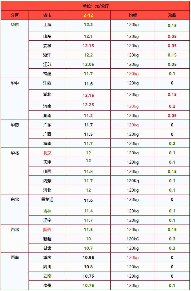 由此分析,在供需变化下,猪价延续滑坡下跌的走势,最新数据显示,受屠宰场调价,预计,2月12日,外三元标猪出栏平均价在11.49元/公斤,后市关注规模猪企出栏以及猪肉购销的变化!