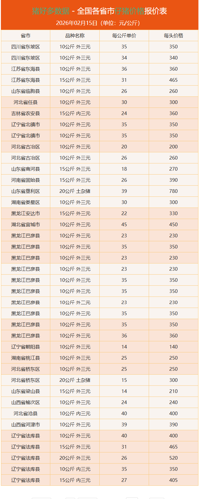 2026年2月15日全国各省市仔猪价格行情报价,涨幅收窄,补栏热情降温