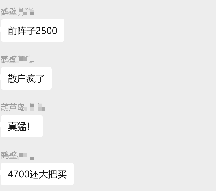 猪易群友讨论,当地散户采购妊娠母猪积极,4700元了还有大把人买。10-11月低点的时候价格在2500元,现在4700元,上涨2000元以上。