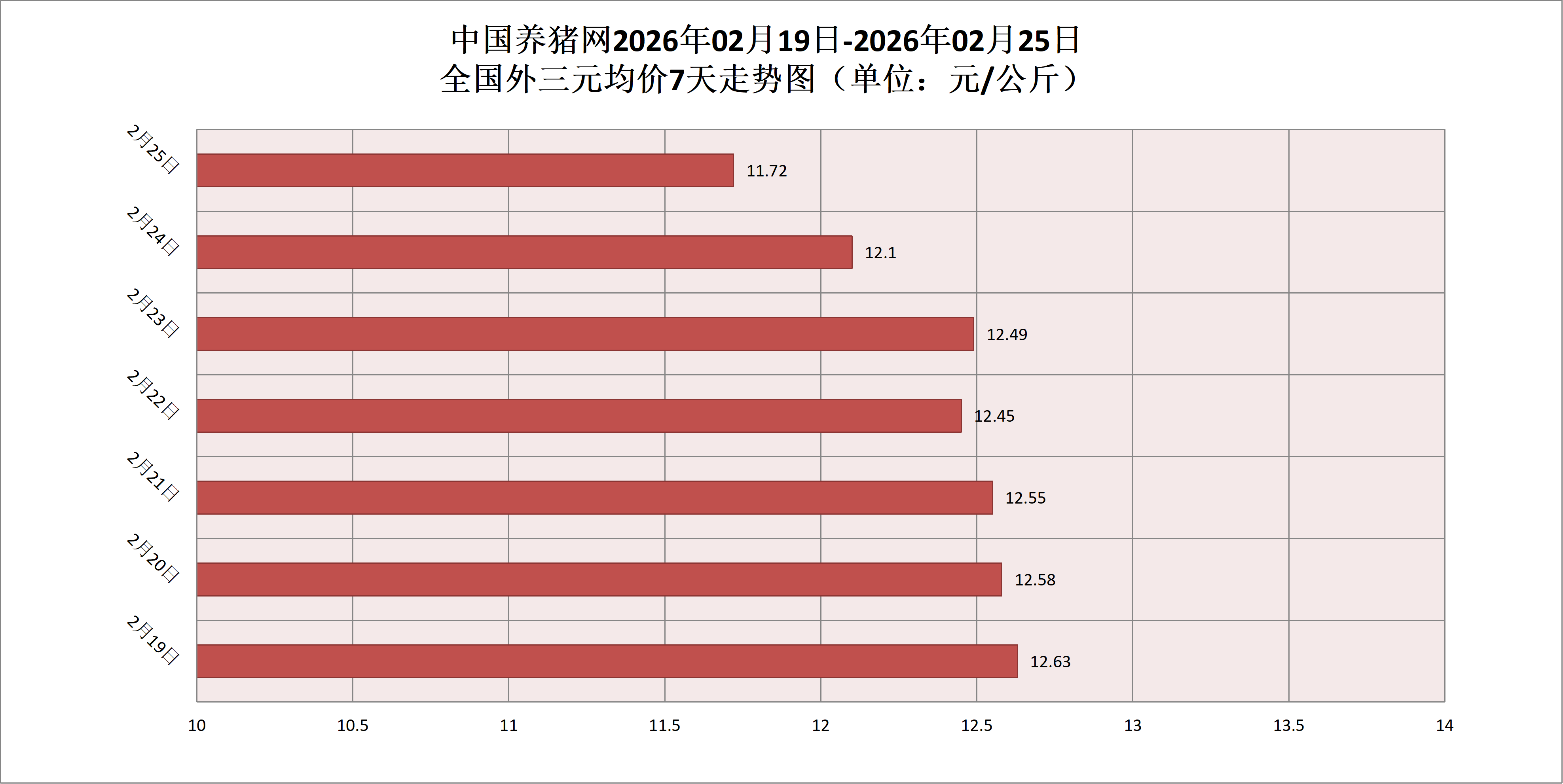 2026年02月25日(星期三),据中国养猪网猪价系统监测,全国外三元均价为11.72元/公斤,猪价较昨日(12.1元/公斤)下跌0.38元/公斤,较上月(13.07元/公斤)下跌了1.35元/公斤。