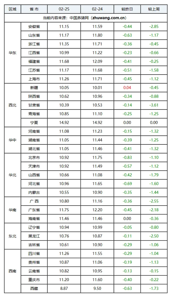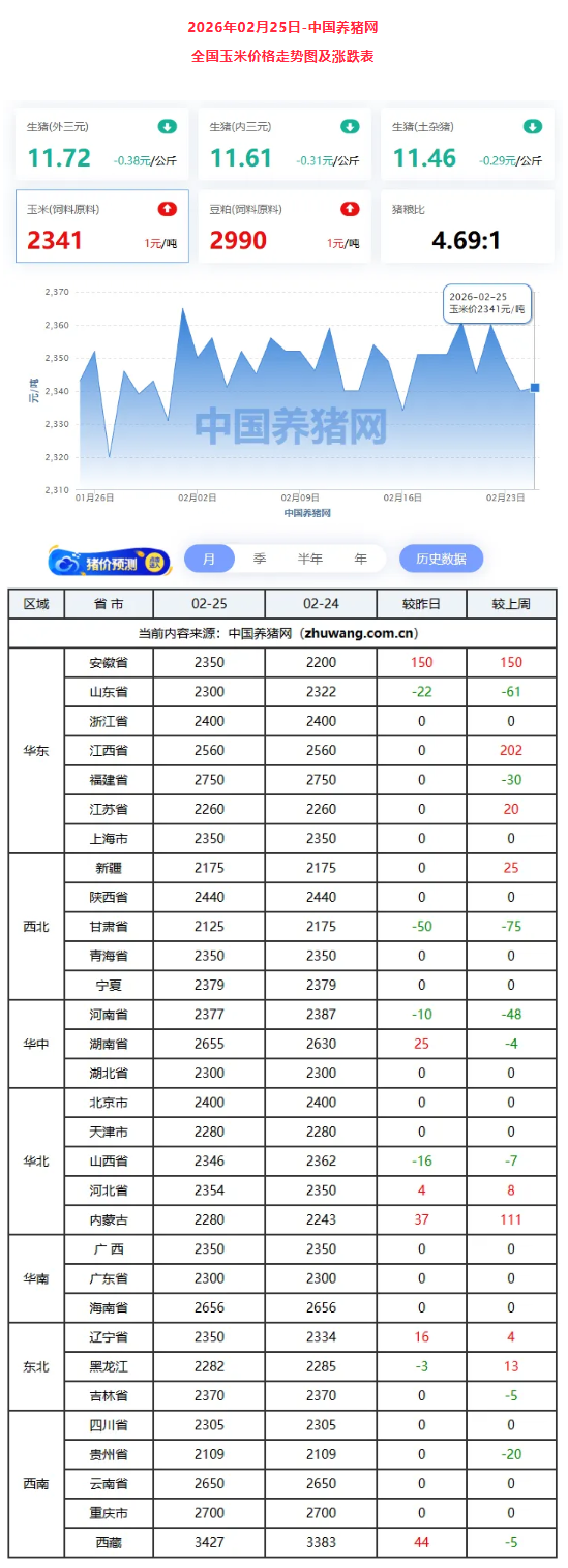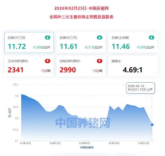 今日猪价延续下跌态势。2026年2月25日,全国外三元生猪均价为11.72元/公斤,较昨日下跌0.38元/公斤。下跌主因是春节后消费进入传统淡季,居民家庭需求下滑,屠宰场开工率偏低。而养殖端出栏积极性较高,数据显示,集团猪企为完成月度出栏计划加大抛售力度,日均出栏量环比增加6.2%-14%。散户受猪价下跌影响恐慌出栏情绪蔓延,全国生猪出栏均重升至126.3公斤,150公斤以上大猪占比增至7.8%。目前市场呈现“供强需弱”格局。展望后市,多家机构预测2026年猪价将呈现“前低后高”的U型走势,下半年随着产能去化效果显现和节日消费带动,价格有望逐步回暖。