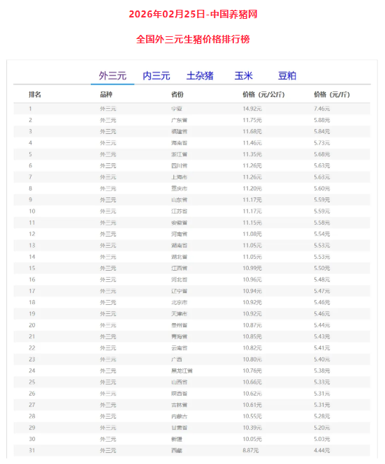 外三元排行前三:宁夏回族自治区14.92元/公斤、广东省11.75元/公斤、福建省11.68元/公斤;