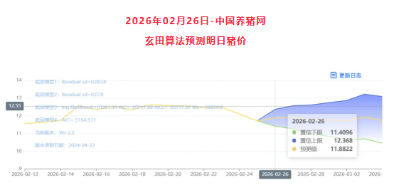 玄田算法是由项目课题组团队原创的非经典逻辑数值聚合理论和不确定性预测方法,构建了基于一致模算子的生猪价格预测模型。该模型采用的聚合函数及一致模相关理论与方法已获得多项国家自然科学基金和省级自然科学资金资助,并获得多项省级自然科学奖奖项。02月26日预测猪价为11.8822,置信区间在11.4096--12.368之间。02月27日预测猪价为11.9049;02月28日预测猪价为11.7835。