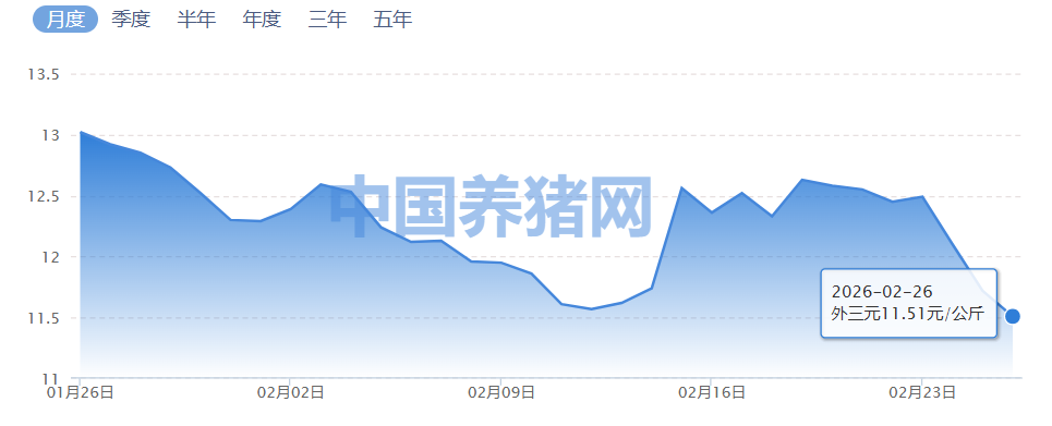 春节的喜庆气氛尚未完全散去,但生猪市场却迎来了一场"倒春寒"。2026年2月26日,生猪市场并未迎来预期的节后企稳,全国外三元生猪均价进一步下探至11.51元/公斤,较昨日再跌0.21元/公斤。这个价格,不仅意味着自繁自养模式下的出栏每头亏损继续扩大,更标志着行业在马年的开端,就踏进了一段深不可测的“冷水期”。