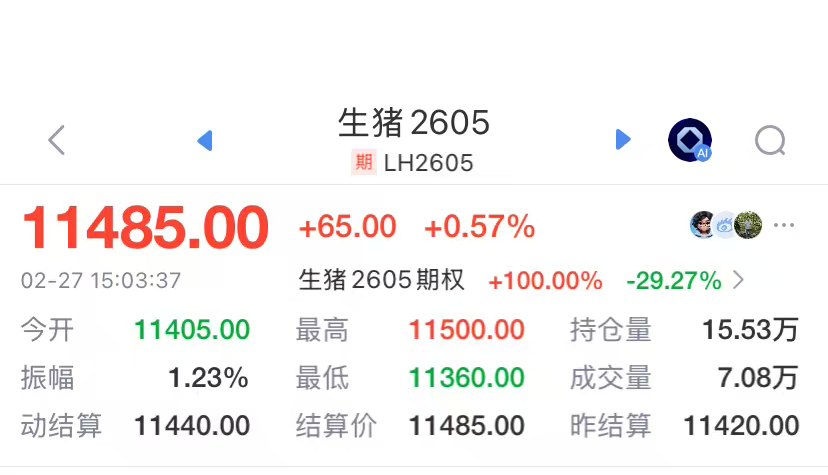 不过市场仍透露出回暖的信号,猪肉股与生猪期货同步出现了回暖趋势。2月27日,生猪期货主力合约迎来一波上涨。截至发稿前,2603、2605、2607、2609涨幅分别为3.96%、0.57%、1.21%、1.28%,主力合约最高报11485元/吨。