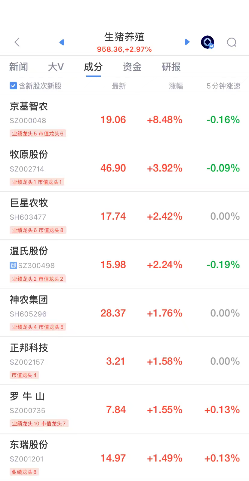 猪肉概念股方面,京基智农大涨8.48%、牧原股份涨3.92%、巨星农牧涨2.42%、温氏股份涨2.24%;此外,神农集团、正邦科技、罗牛山等股均涨1.55-1.76%不等。养殖板块今日主力净流入约3.94亿元,显示市场看好情绪预期改善。