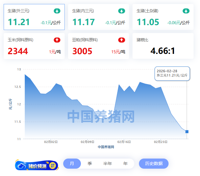 2025下半年开始,猪价就持续下跌。市场原本对2026开年还抱有期待,结果2月24日生猪市场迎来了一场近年来最惨的“复工绿”。这一波跌势直接把市场打懵了。根据中国养猪网的数据,24日全国外三元生猪的均价已经跌到了12.10元/公斤。从南北全线飘绿,标猪和中大猪的价格一起大跳水。而到了2月28日,全国外三元生猪均价较24日又进一步下跌,市场颓势仍在延续。