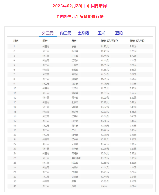 外三元排行前三:宁夏回族自治区14.92元/公斤、浙江省11.49元/公斤、广东省11.44元/公斤;