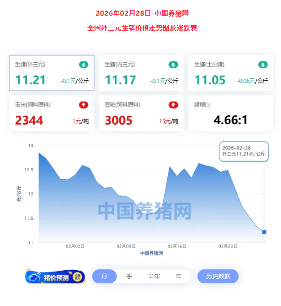全国(生猪品种:外三元)均价为11.21元/公斤,猪价较昨日下跌0.10元/公斤,环比下跌12.76%,同比下跌23.06%;