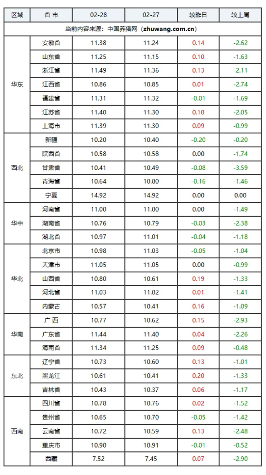 猪价上涨地区(18个):安徽省、吉林省、云南省、海南省、山东省、浙江省、江苏省、江西省、内蒙古自治区、上海市、西藏自治区、广西壮族自治区、广东省、辽宁省、黑龙江省、四川省、山西省、河北省;上涨区间:0.01-0.20元/公斤;