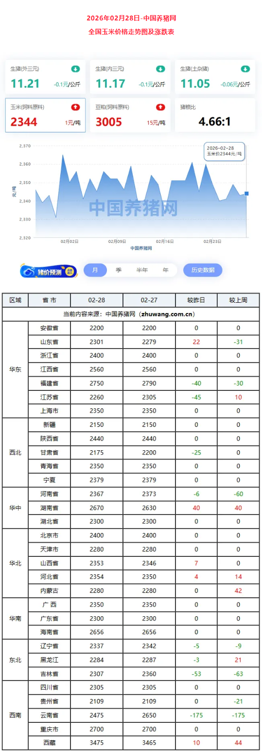 今日全国大部分省市价格较前一日小幅上涨,部分地区略有回落。华东、华北及东北多数地区涨幅较为明显,而西北、西南部分省市则出现下跌。从价格水平看,宁夏依然处于高位,西藏则持续偏低,整体市场呈现稳中有调的态势。春节后生猪供需双降,但供应压力不减,集团猪企出栏节奏加快,市场流通充足。终端消费疲软,屠宰企业开工率偏低。总体看,供强需弱格局下猪价承压下行。不过,随着猪价持续走低,养殖端可能出现扛价惜售情绪,届时猪价或出现一轮反弹行情。