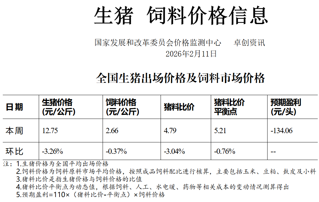 据国家发展和改革委员会价格监测显示,2026年2月第2周全国猪料比价为4.79,环比下跌3.04%。按目前价格及成本推算,未来仔猪育肥模式的生猪养殖头均亏损缩减至134.06元。