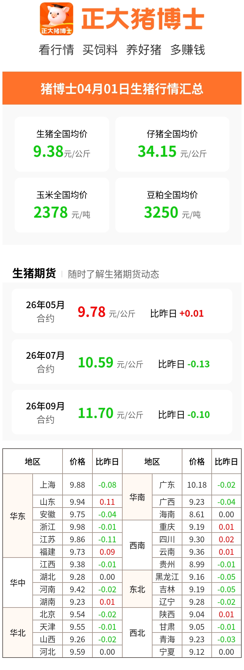 【猪价日报】2026年4月1日 均价10.09元 多数省份持稳