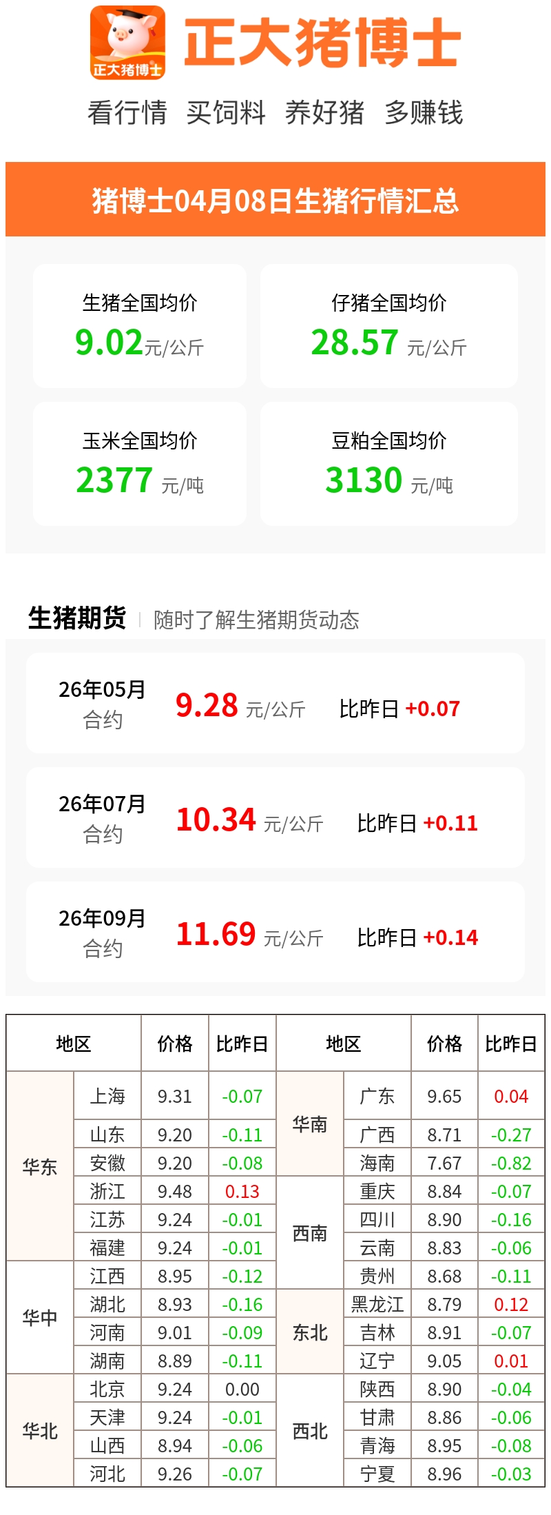 2026年4月8日全国各省市外三元生猪价格,猪价缺乏再降的空间,短暂市场或以盘整为主!