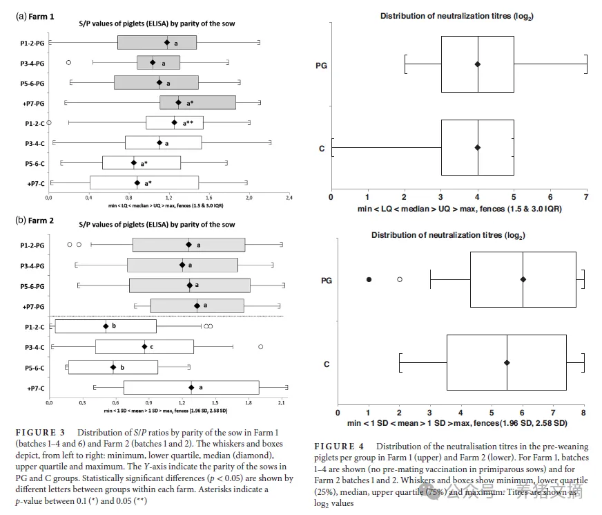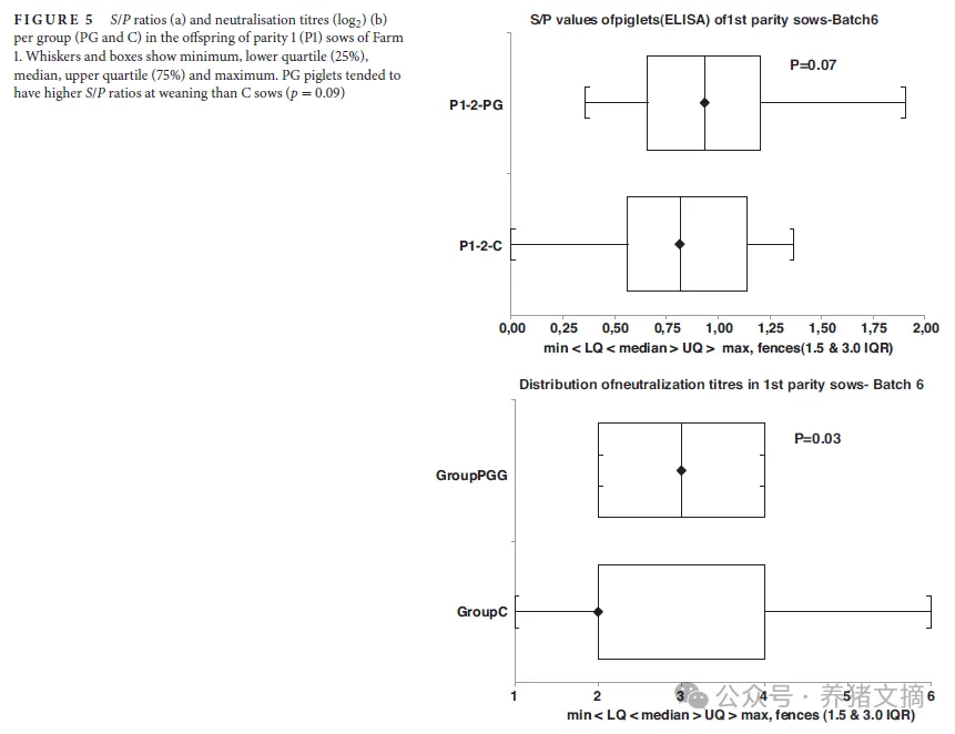 广义线性混合效应模型显示,两个猪场,从4周龄 到6周龄,PG 母猪的后代 PRRSV 发病率低于C组 (p=0.014)。从6到9周龄,蓝耳母源抗体消退后,PG后代的发病率高于C后代(p=0.044)。
