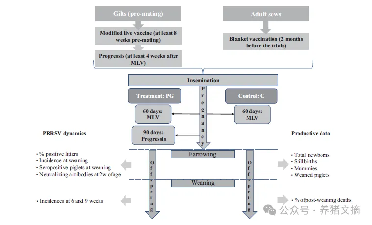 两个猪场的母猪平均被分配两组。原场母猪在实验室前2月普防先前使用的蓝耳弱毒疫苗,而引进的后备母猪在配种前4周接种两次蓝耳弱毒疫苗(间隔4周)。PG组在怀孕60天接种一剂蓝耳弱毒疫苗、在90天接种蓝耳灭活疫苗2ml。C组只在怀孕60天接种蓝耳弱毒疫苗,没有接种蓝耳灭活疫苗。