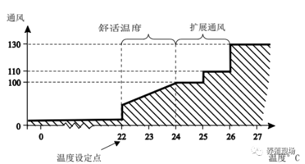 2、在22—24度的舒适温区,风机开启采取平缓上升的趋势,比如:每升高0.5度增加1台风机。