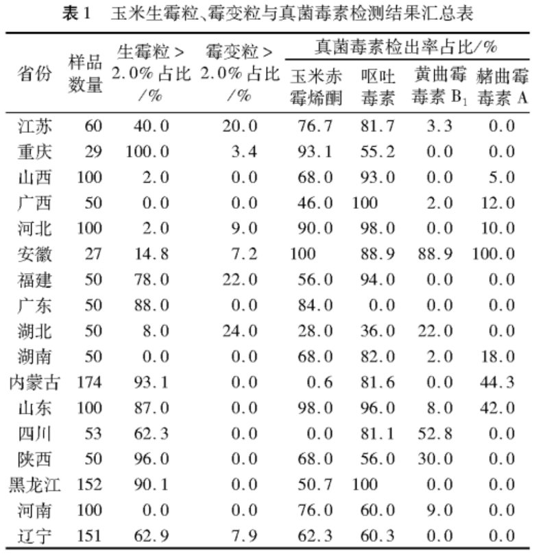 各地玉米生霉粒、霉变粒和真菌毒素的总体情况见表1。从表1可以看出,不同地区玉米生霉和霉变情况不一样,如重庆、福建、广东、内蒙古、山东、陕西、黑龙江等省(市或自治区)玉米生霉情况较严重,江苏、福建和湖北玉米霉变较严重。玉米中4种真菌毒素检出情况也各不相同,有的省份(如安徽,山东、湖南和广西等省份)4种真菌毒素均有检出,而有的省(如广东省)只检出1种真菌毒素。从总体情况看,玉米赤霉烯酮和呕吐毒素检出率较高,黄曲霉毒素和赭曲霉毒素检出率较低。由于玉米赤霉烯酮和呕吐毒素属于田间霉菌产生的毒素,表明玉米收获前已经受到这两种毒素污染;黄曲霉毒素和赭曲霉毒素属于仓储霉菌产生的毒素,由于玉米收获后,尤其是入仓储藏期间,环境条件可以控制,故这两种毒素检出率较低。