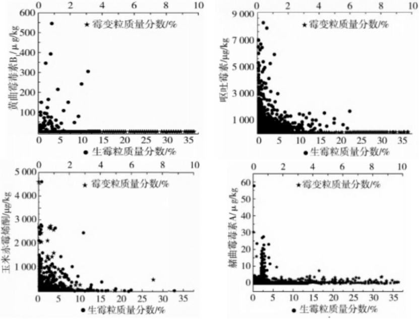 图1表示的是玉米生霉粒和霉变粒的含量与4种真菌毒素含量之间的关系。从图1可以看出,玉米生霉粒和霉变粒与霉菌毒素含量之间没有相关性。有的玉米生霉粒占比很高,但4种真菌毒素含量却未检出,有的玉米生霉粒很少,但检出的真菌毒素含量却很高。
