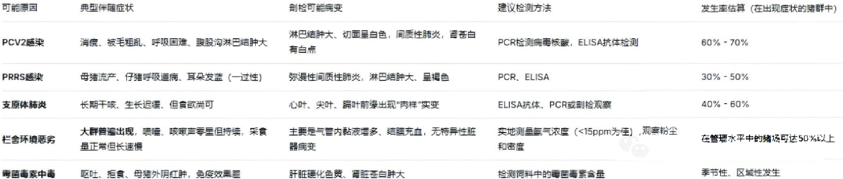 看其他症状:结合上表中的“典型伴随症状”进行判断。例如,同时有咳喘、消瘦,强烈指向PCV2或支原体。