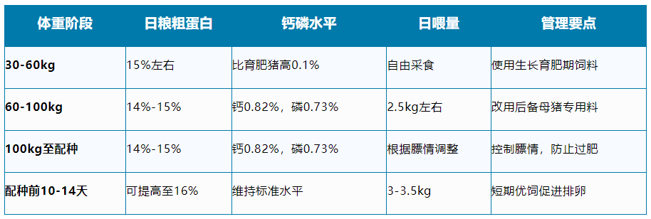 (1)能量调整:代谢能提升至3.3-3.4Mcal/kg,为性成熟储备能量,每日能量摄入确保在7.5-8.0Mcal。