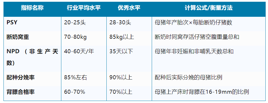 1,关键指标记录:建立母猪个体档案,记录后备母猪初配日龄、配种受胎率、妊娠天数、仔猪出生重/窝数、泌乳量、母猪掉膘情况、断奶后发情间隔,每月统计PSY(计算公式:全年断奶仔猪总数÷母猪存栏数)、断奶窝重(每窝仔猪断奶时总重)、NPD(计算公式:365-(泌乳天数+妊娠天数)×胎次÷存栏母猪数)。