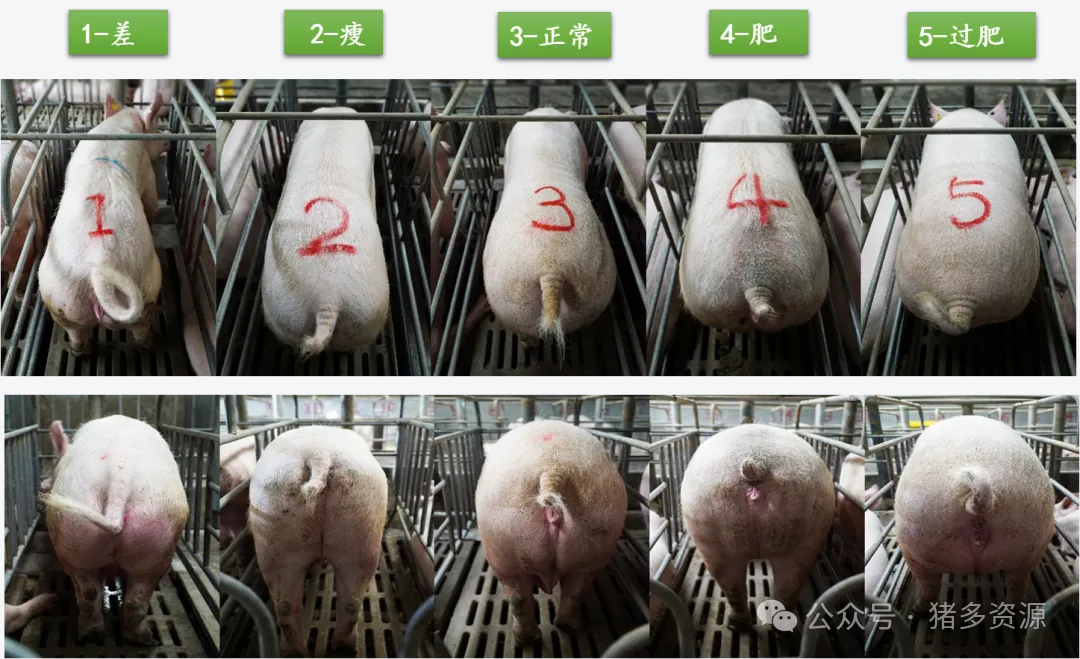 使用BCS系统(1-5分,3-3.5分为最佳)或测量背脂厚度(理想12-16mm)来判断肥胖程度。如果母猪BCS>3.5或背脂>18mm,即视为过胖。