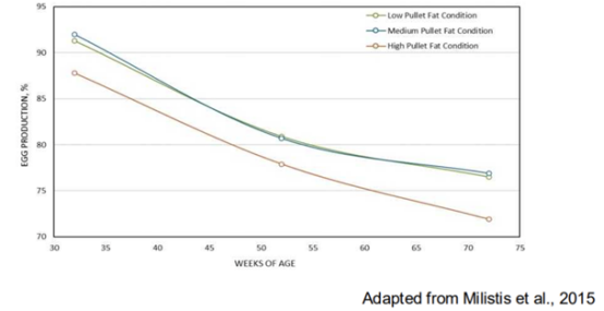 育成期13-15周这个阶段脂肪细胞开始增殖,腹脂沉积效率大大提高,同时也是生殖道的生长、发育和性成熟开始的阶段,这个阶段周增重以不超过70克为宜。所以必须控制育成期蛋鸡的周增重,让鸡群沿着育种公司提供的标准生长曲线生长,最好高于这个标准,前期(0-12周)体重偏低,后期(13周以后)通过催饲,开产时体重达标会需要更多饲料消耗、同时因脂肪沉积多,开产时有脱肛和脂肪肝的风险、产蛋性能和抗病能力也会受到影响(图二)。同样开产体重不达标鸡群可能出现产蛋突降,每只鸡产蛋减少20-30枚。