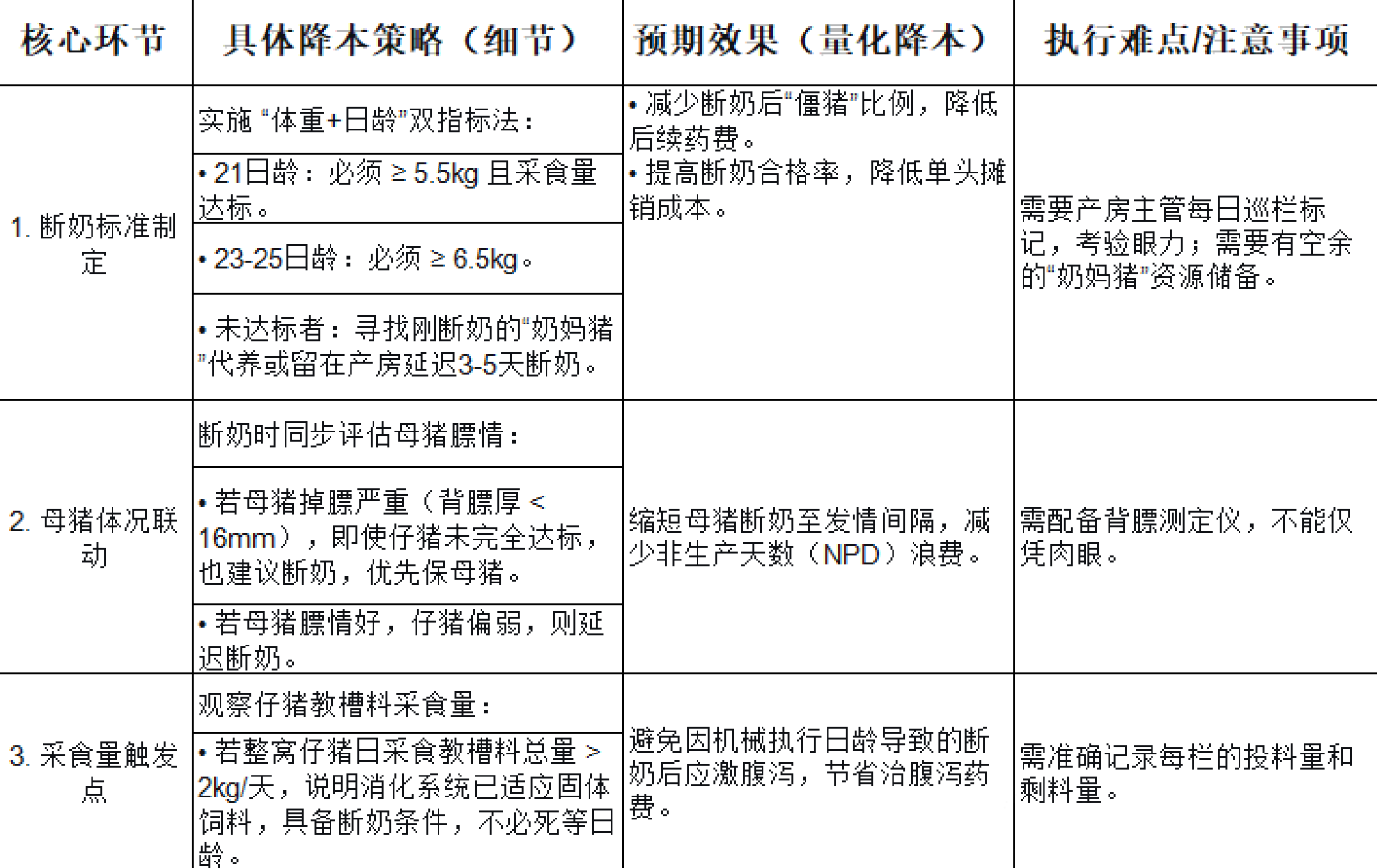 降本策略:建立精确的“断奶决策点”。一旦发现仔猪采食教槽料量达到一定标准(如日采食150克以上),且母猪膘情消耗过大时,应立即断奶,以降低母猪的维持成本,加速母猪进入下一轮配种。
