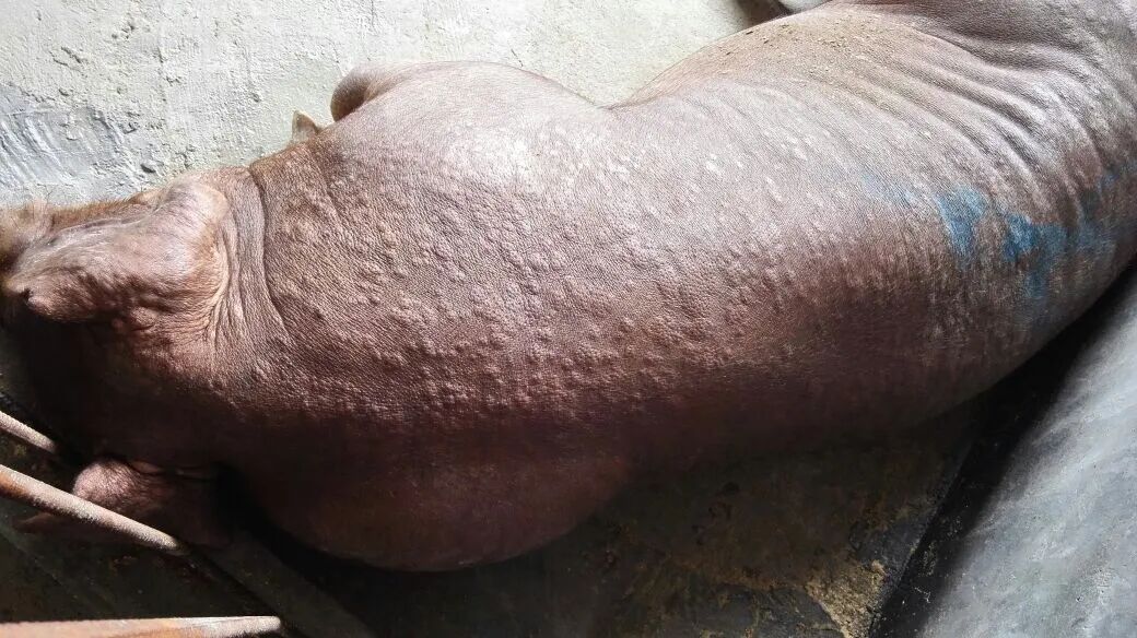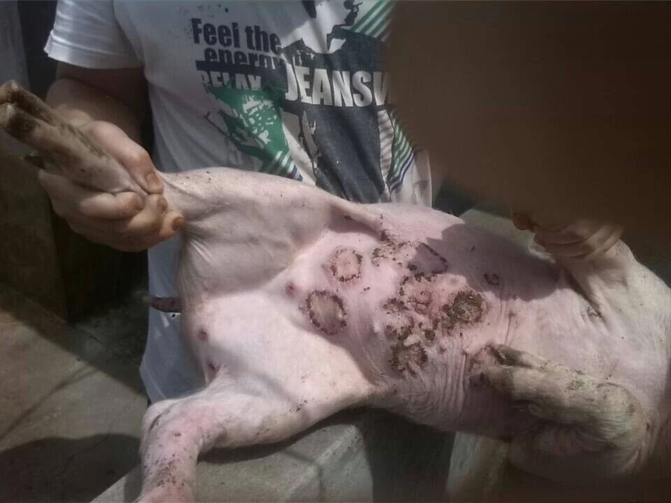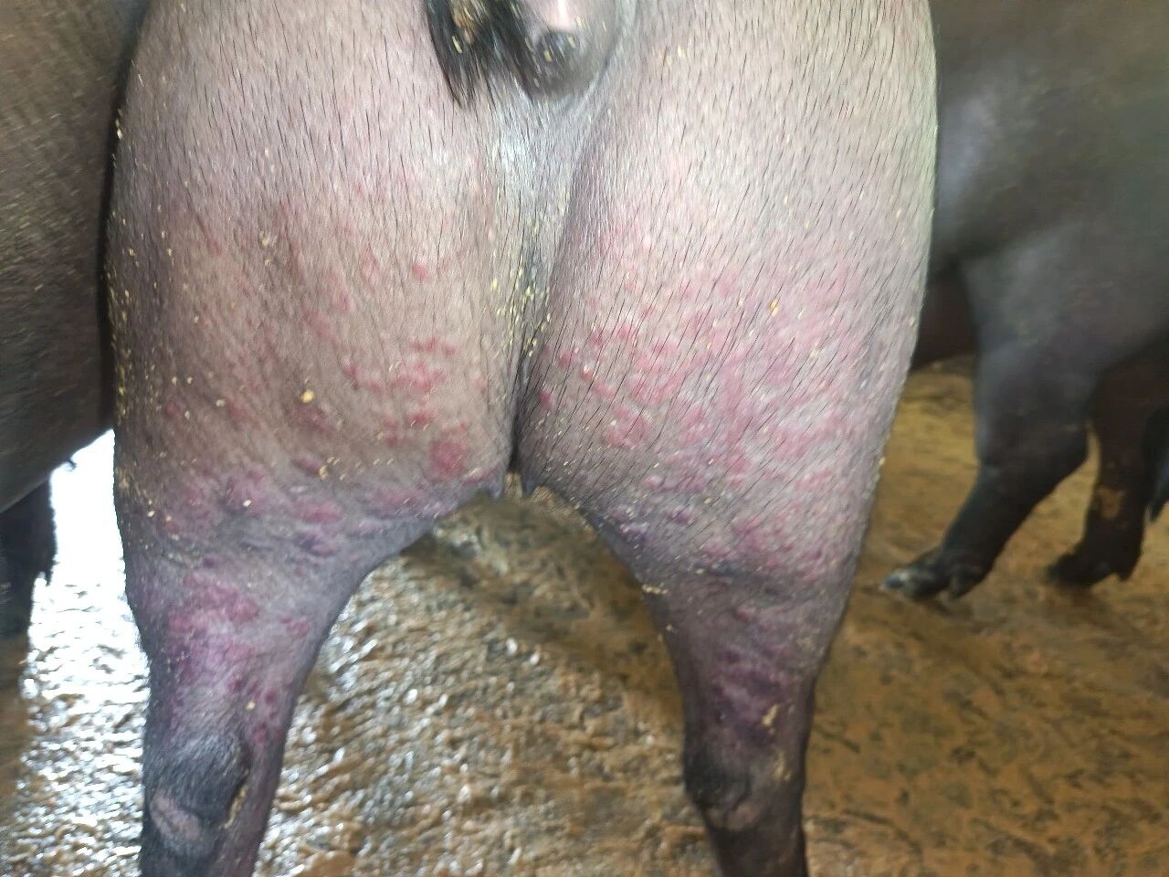 (2) 临床症状:病猪背部、后腿部位皮肤先出现广泛分布的斑点状丘疹,随后丘疹会逐渐蔓延至腹部及全身各处。