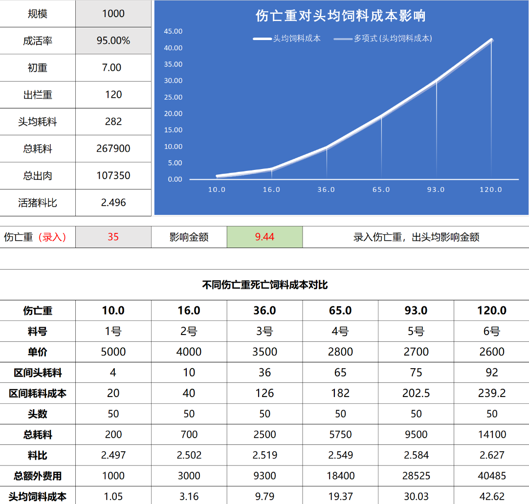 图中的数据,只需关注伤亡重的值及影响金额,其他的数据都是根据伤亡重计算出来的,这个模型是在锁定了成活率,锁定了料肉比后,根据全程伤亡猪只的均重,来评估效益影响;其中伤亡均重35公斤,头均影响金额9.44,而伤亡重15公斤的,头均影响2.80,不要小看这20公斤的影响,在1000头的群体重,对最终的利润影响未6640元;而如果伤亡均重在65公斤,则比35公斤的损失金额又多出了1万多元;
