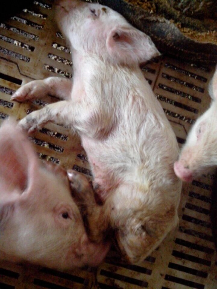 经临床检查发现,该三批仔猪已死亡5头,现存活30头,其中13头仔猪体温高达41℃左右,大部分表现为精神沉郁,不吃或吃食减少,咳嗽气喘,呼吸急促,并呈腹式呼吸,有的鼻孔流有多少不等的黏液性分泌物,同时伴有腹泻症状。其中有6头仔猪后肢关节明显肿大,行走疼痛跛行,步态僵硬,共济失调;部分猪眼睑水肿,耳尖发绀,有的后肢内侧、腹下还出现紫红色或出血性斑块;严重感染的3头仔猪腿已呈“八”字型瘫痪在地,并有神经症状。