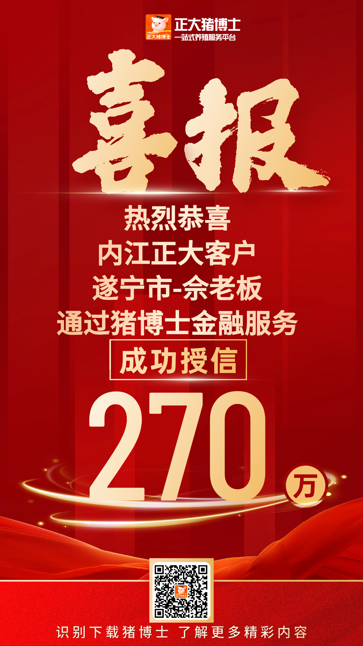 热烈祝贺内江市喻老板融资授信300万〡内江正大